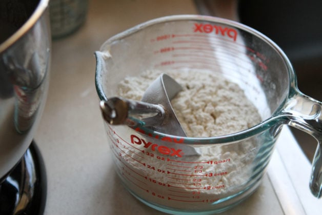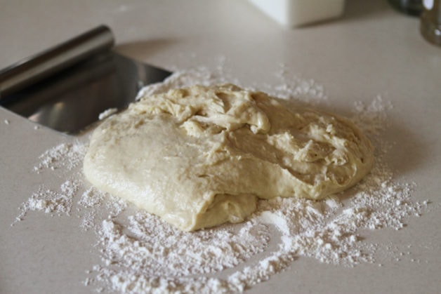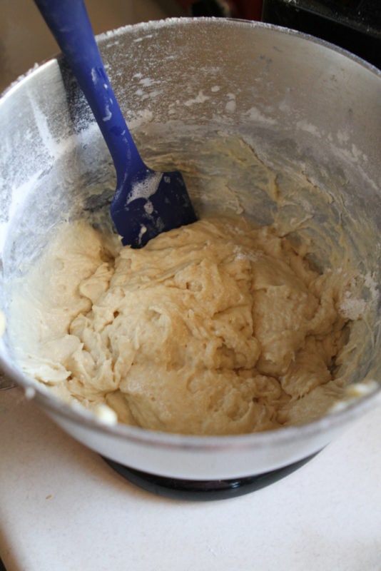 Beat on high speed for three minutes, and then mix in enough flour to make a soft but kneadable dough.