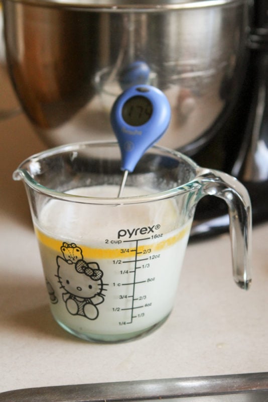 Heat up the milk, sugar, salt, and butter together until the butter melts and the mixture reaches 120-130° F. I just heat this mixture straight in the measuring cup; saves a dish!