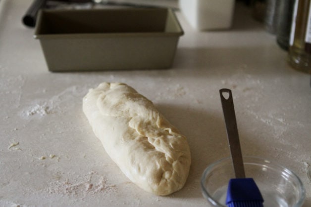 - Roll up from short end, pinching seam ends (brush with water if you need help sealing seams). Place each loaf into a greased 8x4 inch loaf pan. Cover loaves with wet tea towel and let rise in warm place until doubled, about 30-45 minutes.