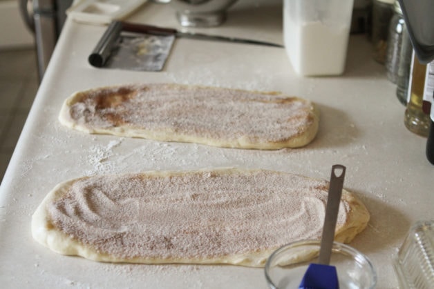 - Combine cinnamon and sugar in a bowl. Brush each dough rectangle with water to moisten, then sprinkle cinnamon sugar evenly over each rectangle.