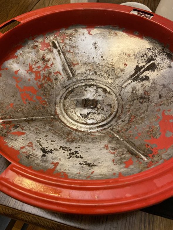 Anyway. For years now, the red finish on the original Christmas tree stand has been wearing off, and the metal underneath has been rusting.