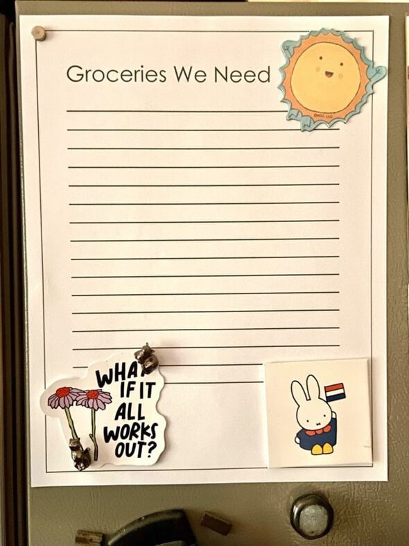 When I make a grocery list, I include the pantry items that I need to restock, plus the perishable foods I need. To help me keep track of what staples I need to replace, I keep a simple list on the side of my fridge and I write things down there when they occur to me.