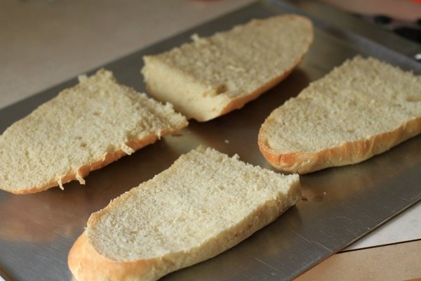 Cut the French bread loaves in half lengthwise and place them on a baking sheet. Or if you want to make the cutting process easier, cut the loaf in half and then cut it lengthwise, like so: