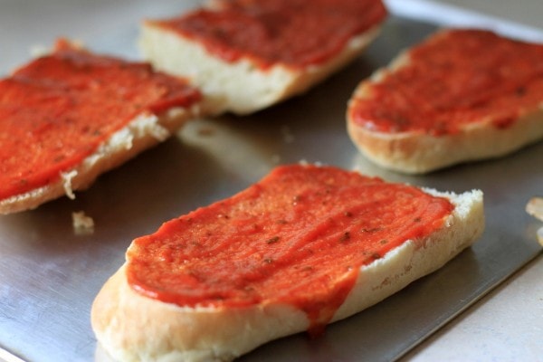 Spread them with tomato sauce. It’s good to be a little stingy here, because you’re putting tomato sauce onto a very porous surface, and if you are heavy-handed with the sauce, your pizza will be on the soggy end of things.