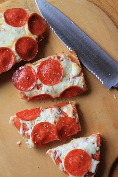 Love reading your blog! I used to work at an Italian/pizza restaurant and we made something similar to this. To keep the tomato sauce from making your bread soggy, just put a thin layer of butter on the bread before you put the tomato sauce on. Happy pizza bread!