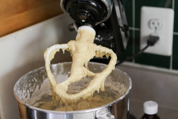 Add the warm milk mixture to the mixer bowl, and beat until combined.