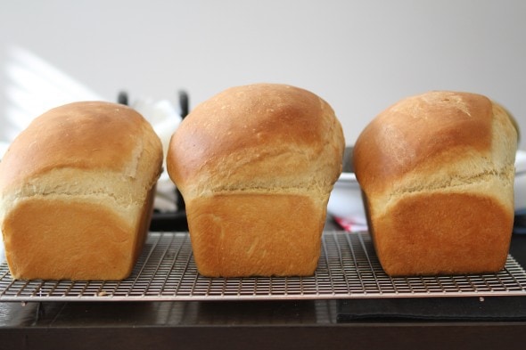 This soft, slightly sweet bread is lovely on its own but also makes great sandwiches. You can make shorter loaves by using larger loaf pans. Or you can halve the recipe and make two loaves in the 8x4 inch loaf pans.
