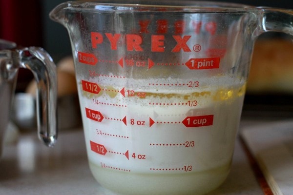 Next, combine the milk, oil, sugar, and salt, and heat to 125° F. You can do this on the stovetop or in the microwave.