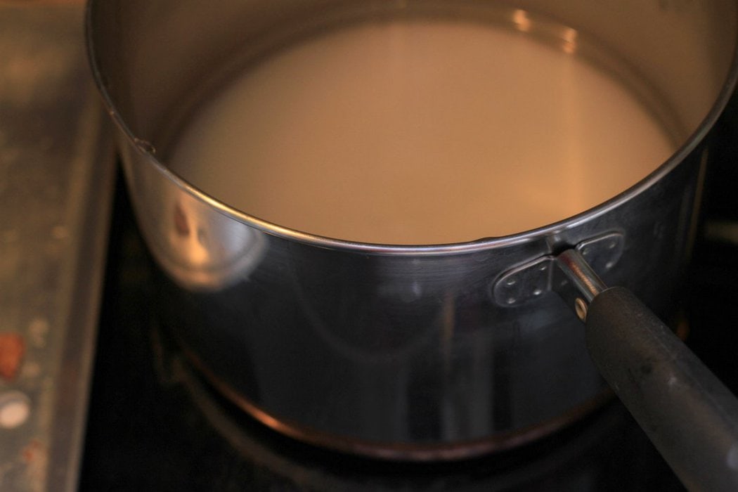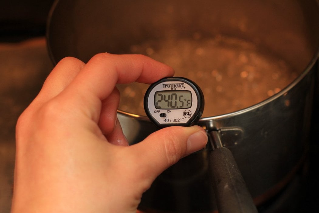 Over medium heat, bring this to a boil, and then cook it, swirling the pan, until it reaches 240 degrees (240.5 also works.)