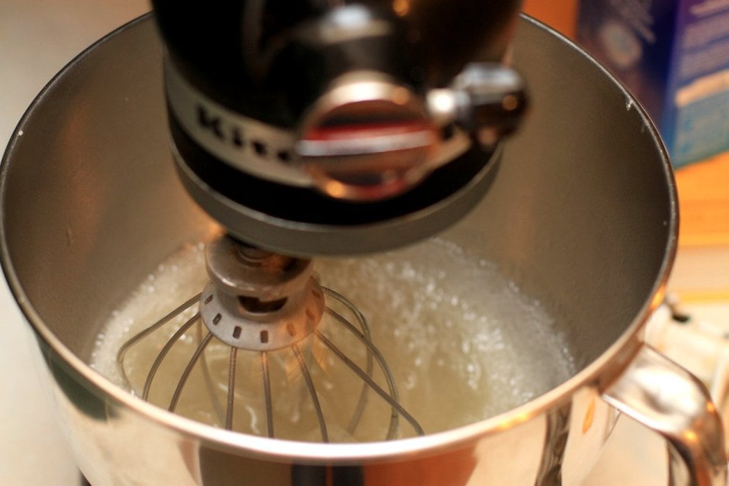 Increase the speed bit by bit until you’ve reached high speed. Then let the mixer go for 10-12 minutes, or until the mixture is really stiff. It’ll look fairly stiff after just a few minutes, so set a timer instead of just going by sight.