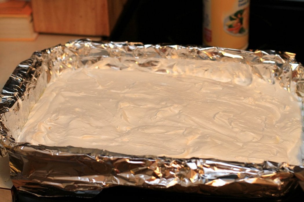 Don’t worry too much about cleaning out the bowl thoroughly. If you mess with that for too long, the marshmallow mixture will get too cool to spread neatly.