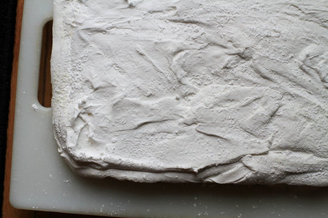 The next day, dust a cutting board with 2 tablespoons confectioner’s sugar mixture. Invert 9×13 pan onto the cutting board, peel off the foil, and dust slab with 2 tablespoons confectioner’s sugar mixture.
