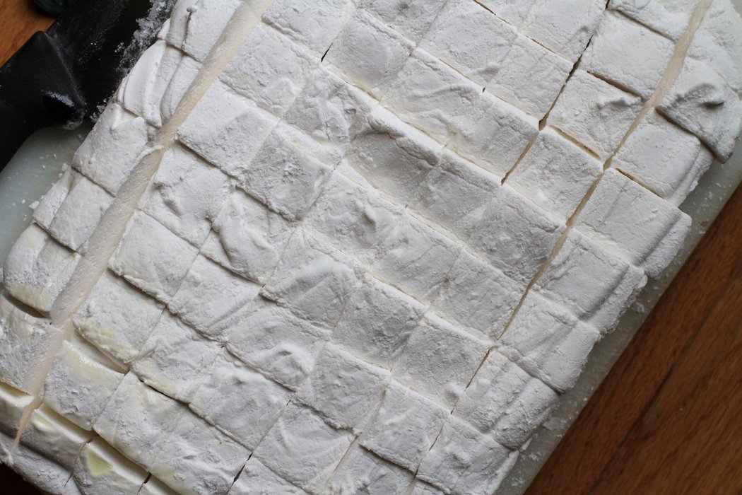 Then, using your greased knife, cut the marshmallow slab into cubes.