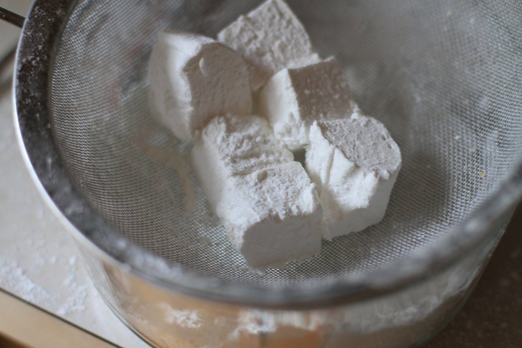 Working with several cubes at a time, toss marshmallows in confectioner’s sugar/cornstarch mixture, then shake in mesh sieve to remove excess sugar. Repeat with remaining marshmallows.