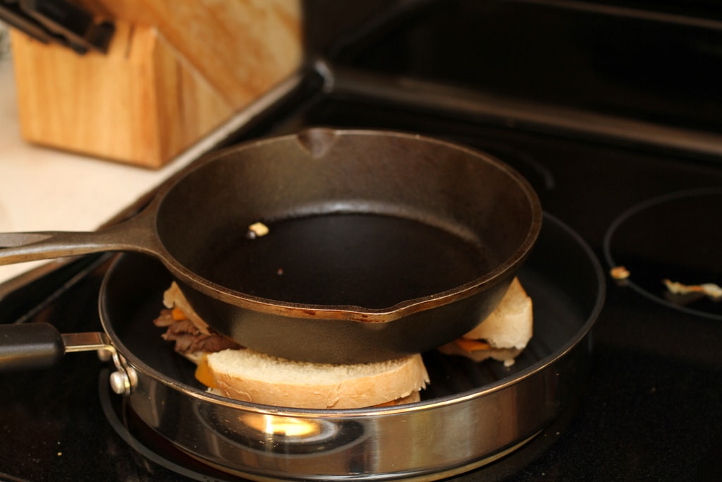 And I put the heated cast iron pan right on top of the sandwiches. This would work a little bit better if I had a larger cast-iron pan, but my other one is so big, it won’t fit into my grill pan.