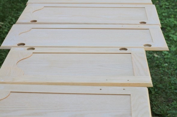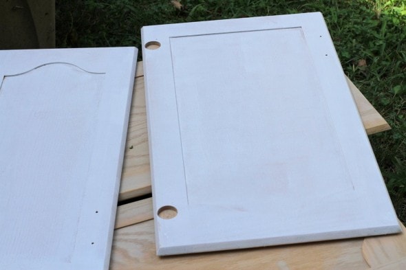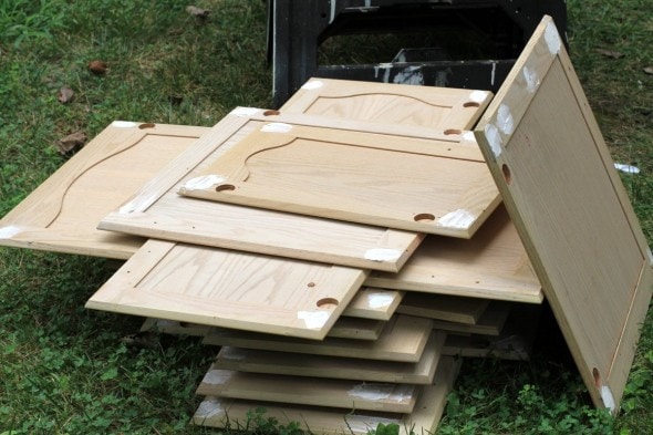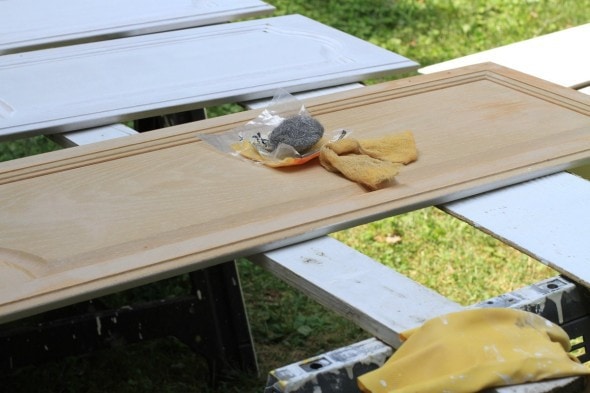 After I finished using the orbital sander, I went over all the doors and drawers with steel wool. This was especially helpful for the parts on the doors that the orbital sander couldn’t reach (like the recessed areas).