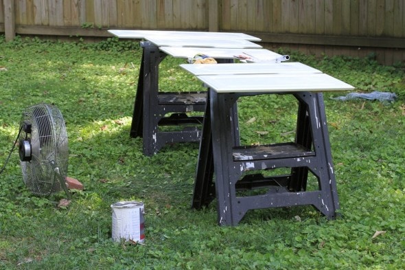 I had way more doors than sawhorses, so as I painted the doors, I moved them from the sawhorses to all sorts of makeshift drying spaces…
