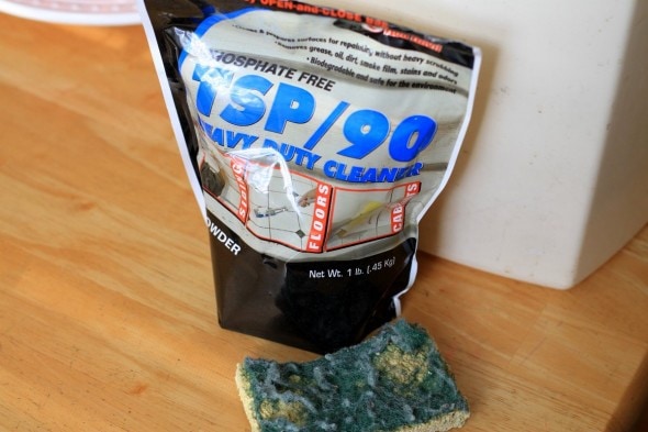 A reader’s husband suggested this to me, and I must say, it worked great. Kitchen grease is tough to get off of cabinets normally, but the TSP made it pretty easy to scrub off.