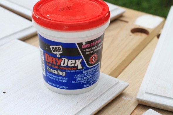 I used DAP DryDex spackle, which is a pretty handy product. It looks pink when you first apply it, and then when it’s dry and ready to sand, it turns white.