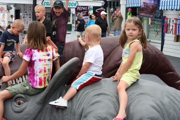 Not far from the fountains, two large dinosaurs stand in the middle of the walkway. These are most popular with the small crowd, of course (my two year old nephew didn’t want to get off).