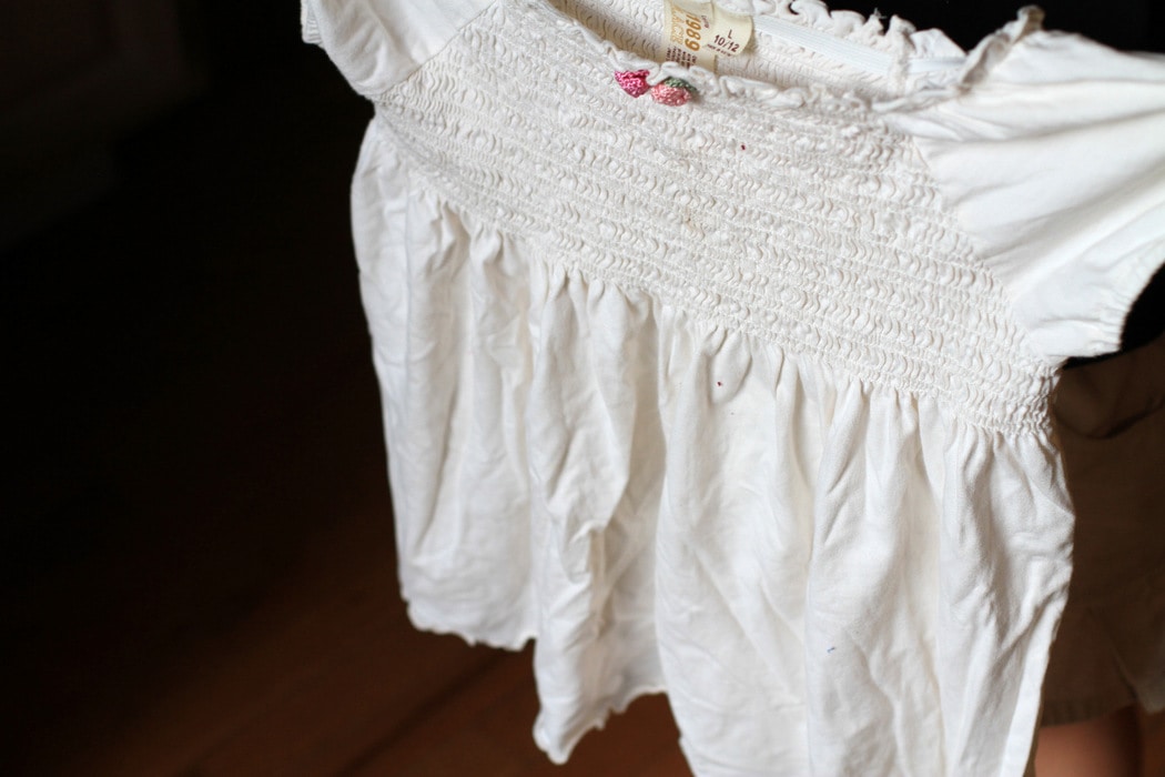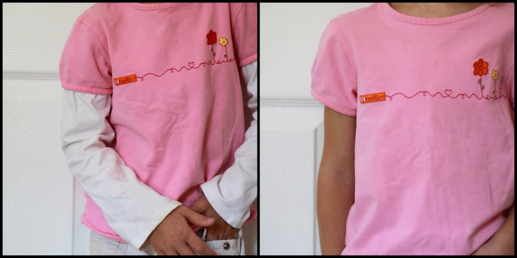 For example, this hand-me-down shirt had impossible stains on the sleeves, so I just cut them off to make a stain-free short-sleeved shirt.