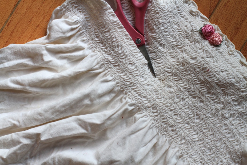 First, I decided how tall I wanted the waistband to be, and I carefully cut across the bodice of the shirt, using one of the lines of elastic as my guide.