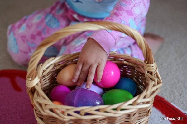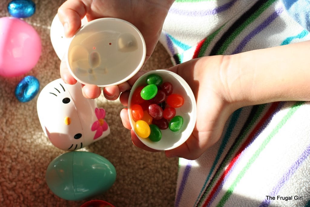Using these plastic eggs means we don’t have to buy that dreaded Easter grass and it also means that we don’t have to buy individually packaged candy.