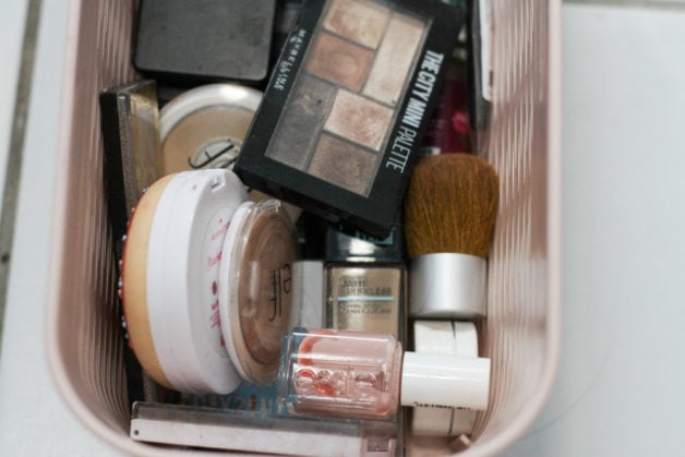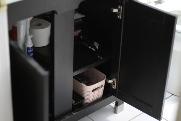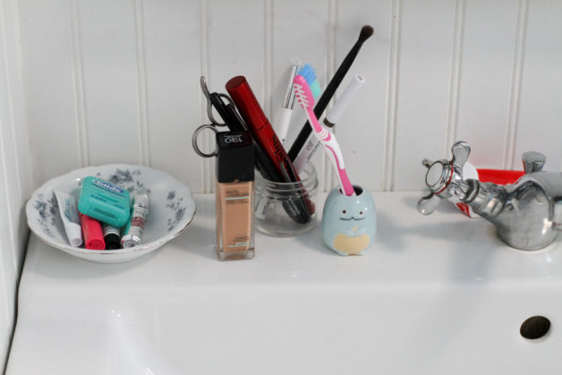 Let’s start with my bathroom. I don’t have a medicine cabinet, so my regularly-used stuff just sits on my sink.