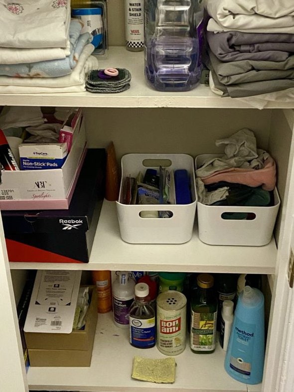 My bathroom cabinets have some baskets/bins in them, but they don’t match.
