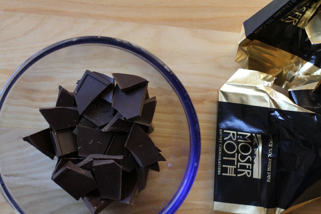 I made ’em with two ingredients, both from Aldi. Aldi has a number of different flavors of chocolate, but the 70% dark is what I always buy.