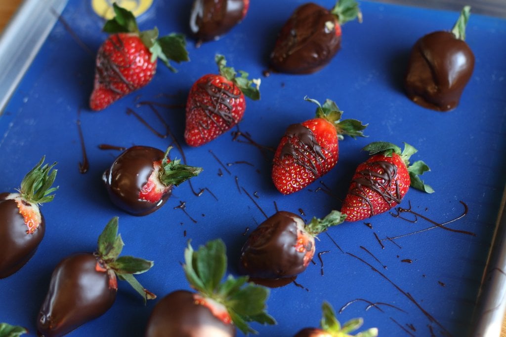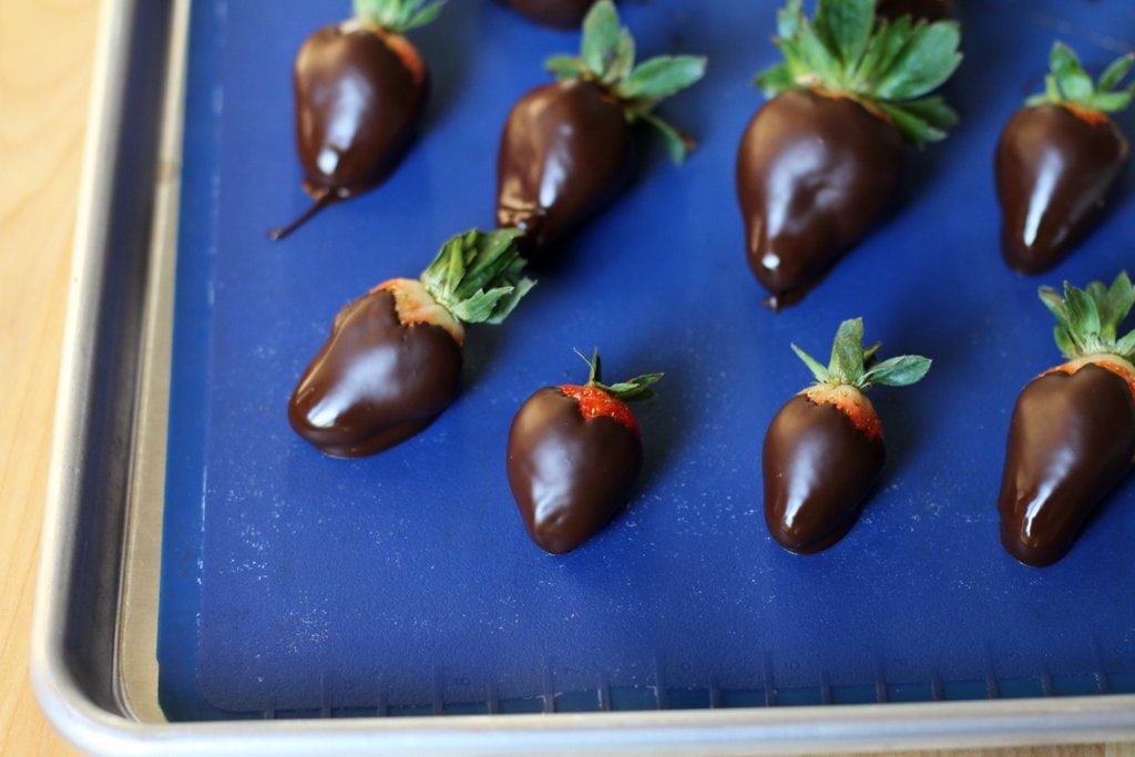 Dip the strawberries into the chocolate, and lay them on a lined baking sheet to set. Wax paper was suggested, but I dug up my silicone pan liner and used that instead.