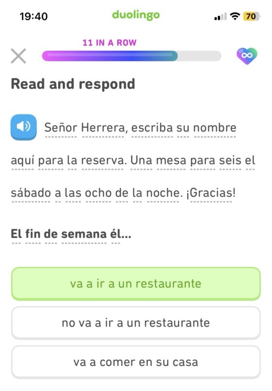 I'm using Duo Lingo for Spanish as well. I used 2 freezes this week to keep my 167 day streak (sad face); it's been quite a week - and it's only Thursday! Happy to say that I could read what you posted above so I must be learning something. I took Spanish language classes and some teachers said that though many people believe that it's easier to learn another language as a young child than as an adult, that's not accurate. They said that kids learn faster as they're less afraid of making mistakes, they don't get embarrassed as easily so are less afraid to USE they language that they have acquired. They also chatter away at themselves or sing for no specific reason and they will do that in the language they are learning as well as the one(s) they already know. Adults, generally, are the complete opposite.