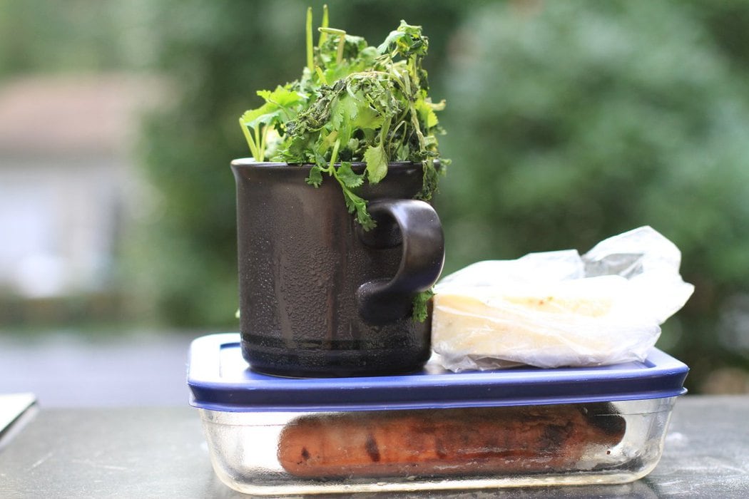 The cilantro went south surprisingly soon (I did use up the entire bunch I bought after that, though!). I’m sad about the moldy cheese, but the two hot dogs left over from a cookout, I’m not that sad about. It’s not like hot dogs are terribly nutritious, so I wasn’t too motivated to get someone to eat them. I’m much more pleased that we ate up the cauliflower and broccoli and spinach, you know?