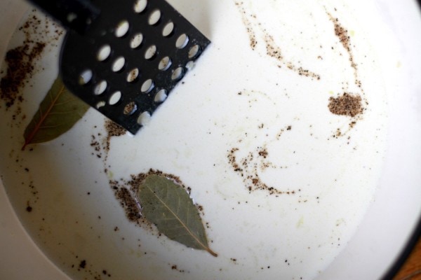 Then stir in the cream, milk, thyme, bay leaves, salt, and pepper.