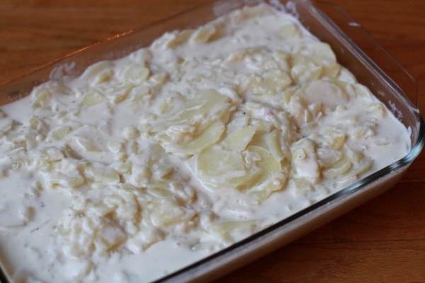 In fact, it calls for 3 cups of cream plus a cup of whole milk. However, I have varied the proportions of milk to cream (2 cups cream, 2 cups milk) when necessary, and the potatoes have still been quite good. I would not, however, advise you to replace all of the cream with milk. If you want to use milk instead of cream, you’ll need a difference sort of recipe, one that has some method of thickening the sauce.