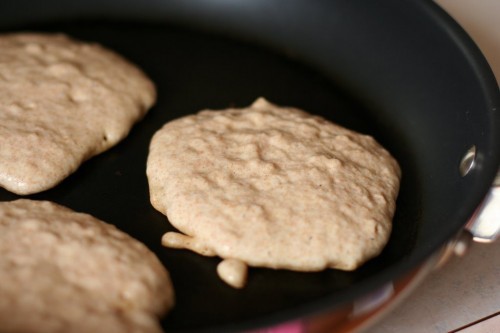 Let the batter sit while you heat a skillet over medium high heat. It’s hot enough when a drop of water sizzles immediately after landing in the skillet.