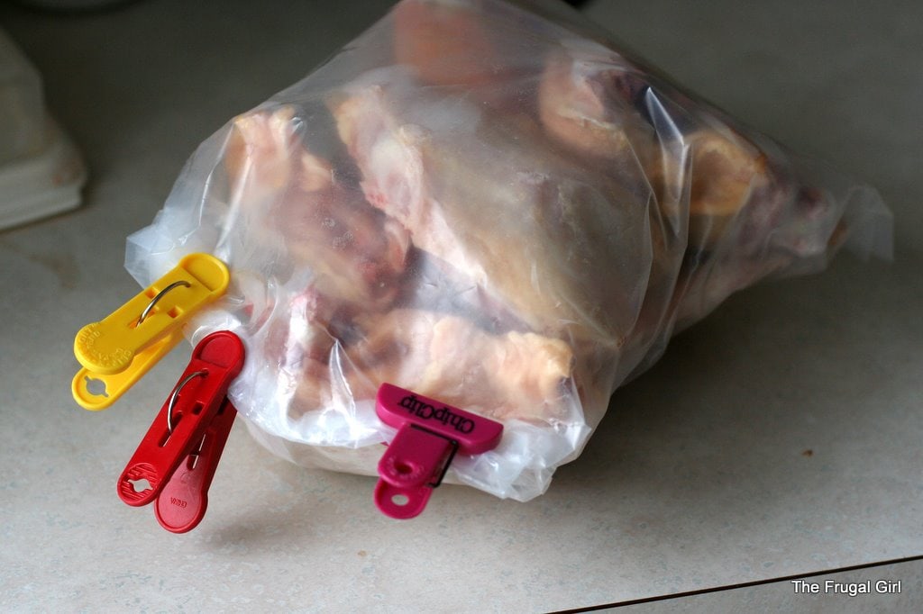 1. If the bag of frozen chix stays frozen, then you don't need to clean it. Empty it, leave it in the freezer, fill it up with the next batch. It helps to write "raw chix" on the bag so you don't forget between batches.