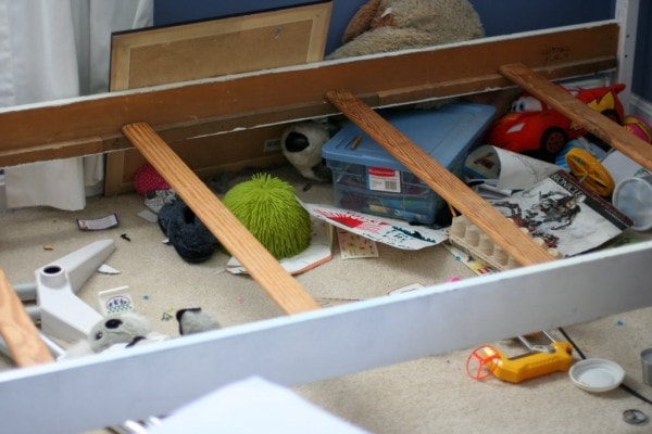 So, we took the bed apart, and found it necessary to do a little bit of decluttering and vacuuming.