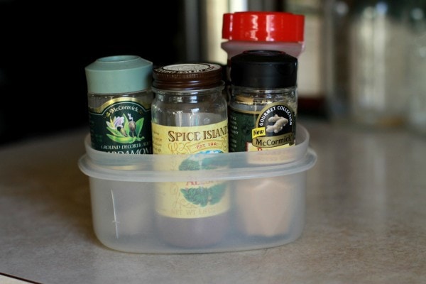 We currently split our spices into two plastic containers for baking spices in one and cooking spices in the other. I really love the idea of splitting out my cayenne/hot spices from my italian spices from my meat prep spices. I might have to investigate whether or not I have some smaller containers around.