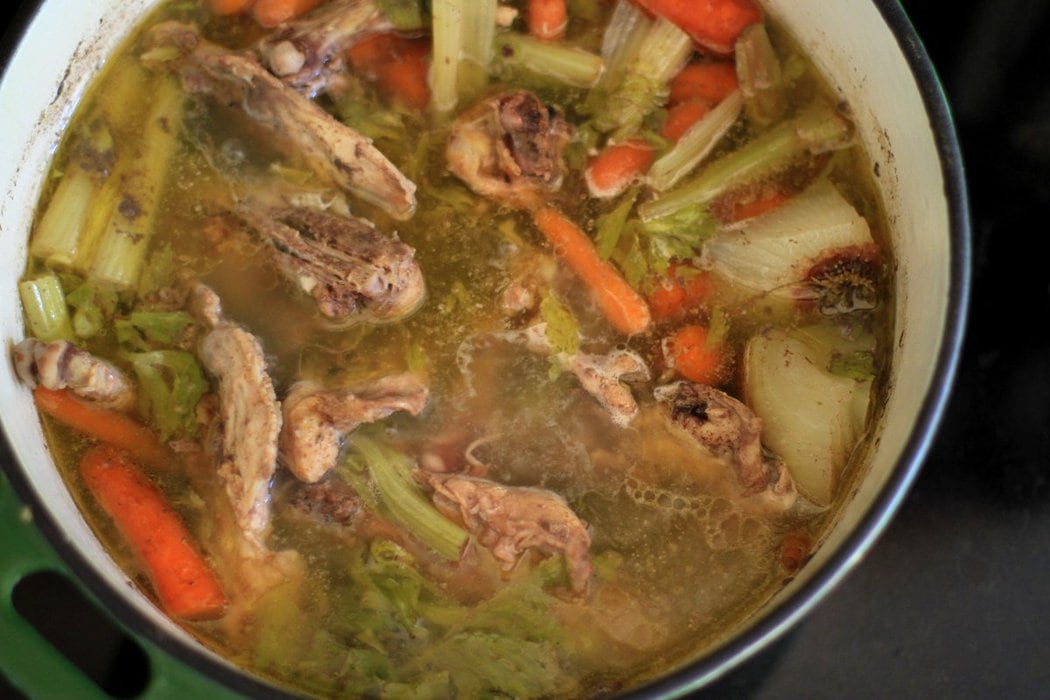 -Chicken broth, made with chicken bones from my freezer, some carrots and celery that needed to be used, and an onion.