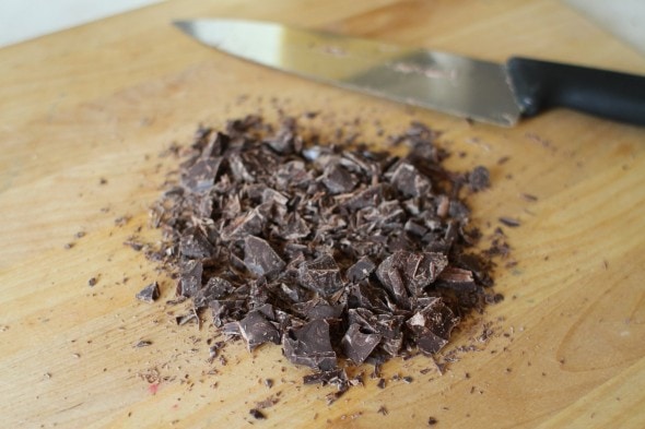 You’ll need to chop up 6 ounces of chocolate first. I normally eat 85% dark chocolate, but since I wasn’t planning to eat the sauce all by myself, I used a mixture of 70% and 60% dark chocolate.
