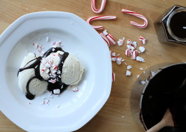 Once the sauce is slightly cooled, pour it atop some ice cream, and then sprinkle with chopped candy canes.