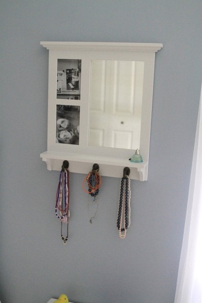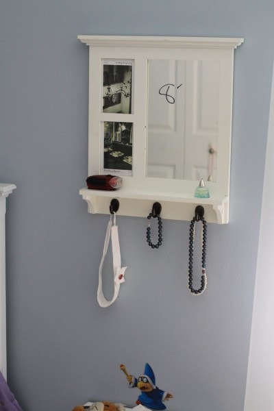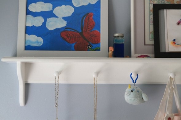 The shelf used to house our board books, but now it’s holding Lisey’s things (you might recognize her framed butterfly art from this post about using old frames.)