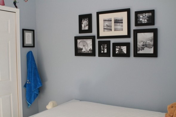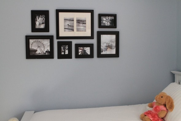 Here’s the grouping of frames we came up with for her wall. I took a bunch of frames that were in this room before, laid them out on the living room floor to find a good grouping shape, and then Lisey and I looked through my picture files to find things she wanted on her wall.