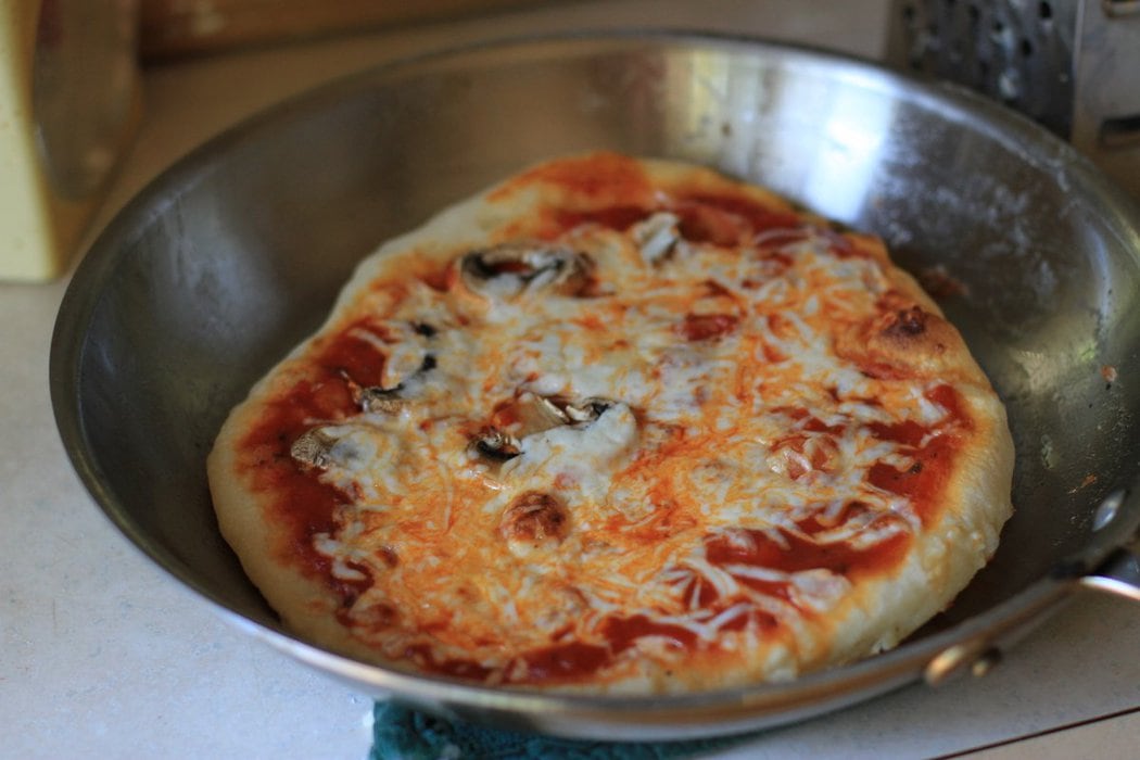 That way you don’t have to wait a whole hour for a pizza stone to heat up in the oven. And this worked pretty darn well, except for the fact that I let my skillet get a little too hot when I made the first pizza.