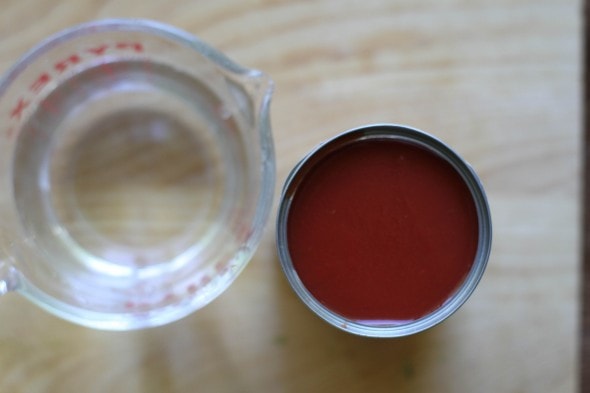 And after about 30 seconds, you’re going to stir in tomato sauce and water…