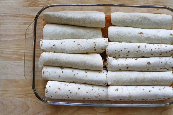 Spread 1/2 cup of the red sauce in a 9×13 inch pan. Then roll up your tortillas tightly, and place ’em seam side down in the pan.