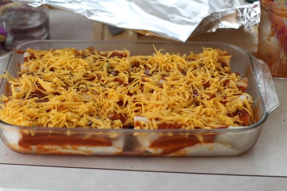 When you’re ready to bake, pour the sauce over the enchiladas, and sprinkle cheese over top.