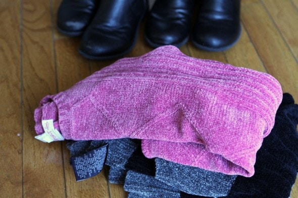 So that Sonia and Zoe could both have a pair from the pink sweater, I made one set from the sleeves and then I cut and sewed two tubes from the body of the sweater to make another pair, using the sweater hem as one end of the sock.