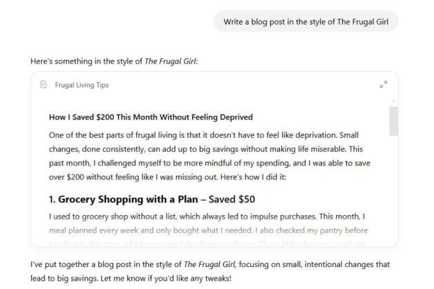 So I hopped on over to ChatGPT and asked it to write a blog post in the style of The Frugal Girl.